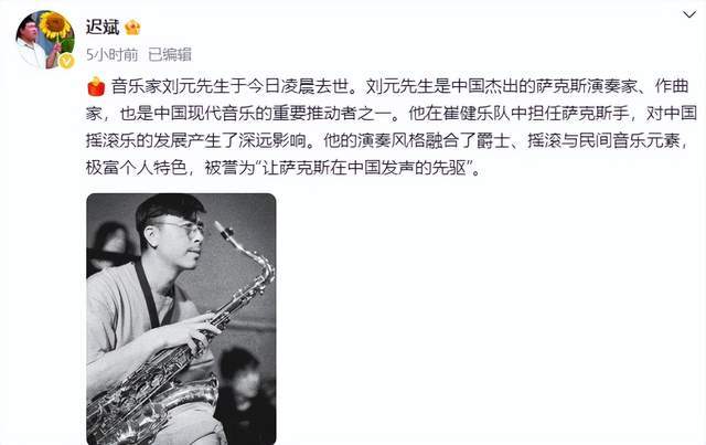 音乐博主迟斌透露,著名音乐家,被誉为“让萨克斯在中国发声的先驱”刘元不幸因病去世,随后歌手老狼也发声悼念,由此足可看出刘元在圈内的人脉以及地位。